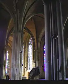The interior was damaged by fire in 1944, but much less than the other medieval churches of the city. When the new organ was installed in 1953, the acoustics were so poor that in 1958 the city assigned Dieter Oesterlen to manage the church's refurbishment. The residual medieval plastering and the remains of the frescos were removed, leaving plain brick walls. In 1966, the French artist Alfred Manessier was charged with redesigning the 19 windows that had been destroyed during the Second World War. Inspired by verses from the Bible, he embarked first on the design of the four main windows, employing brightly coloured stained glass representations with expressive linear patterns. Together they depict various manifestations of the Word of God. At the end of the aisle to the north of the altar, the Christmas Window is inspired by "The Word became flesh" (John 1:14), while the Pentecost Window at the east end of the chancel is inspired by the Miracle of Tongues (Acts 2). The Sermon Window symbolises the preached word: "We are ambassadors for Christ" (2 Corinthians 5:20) while the Virgin Mary Window, a rose window at the opposite end of the church draws on the Christmas story: "Mary kept all these sayings, pondering them in her heart" (Luke 2:19).[2] With the assistance of François Lorin from Chartres, Manessier completed his work in 1979.[3]