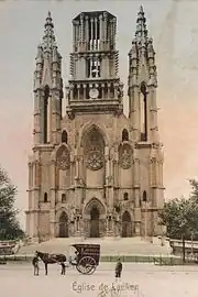 The architect Joseph Poelaert was chosen to design the new church.[2] He later became best known for the Law Courts of Brussels. The project initially selected was a fairly simple brick building with stone bands and whose facade was surmounted by a single spire covered with slate. In 1853, the jury proposed to modify the project in the direction of greater monumentality, with a neo-Gothic facade with three spires. This led to an overrun of the initial budget, which was the first of a long series.[3]