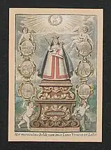 The Marian image is a 13th-century wooden carved statue in the Romanesque style as the Sedes Sapientiae (English: Seat of Wisdom), with the enthroned Madonna and Child holding a scepter of Fleur-de-lys and a dove (representing a soul), respectively. The image is vested with imperial regalia of blue velvet fabric with golden embroidery and surrounded by four pillars with inscriptions bearing various Marian titles from the Song of Songs. Pious legends claim that Archduke Leopold Wilhelm of Austria moved this image in 1652 to the Collegiate Church of St. Michael and St. Gudula (future cathedral of Brussels) due to a long drought, and was later returned to Laeken, where it rained.