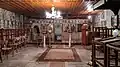 There are two entrances, with wooden double doors, one in the narthex on the west side and one in the main part of the church on the north side. The sanctuary ends in the semicircular apse with a hemispherical dome. In the north and the south wall of the sanctuary is formed by a niche with arch. In the dome of the apse there is an opening with a sloping upward direction, blind (with closed end), which served in the past, probably, the ventilation of the sanctuary. The wooden iconostasis is decorated with embossed elements, partially gilded and with written plant and geometric depictions. According to the literature, this is the original iconostasis of the church. In front of the iconostasis there are two stone carved Candlesticks. The floor of the building is paved with large, irregular slate slabs, joined with cement mortar.[6]