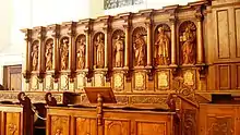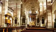 Saint Maurice served as the abbey church of a now defunct Benedictine monastery, founded in the 7th century and belonging to the oldest in Alsace.[3] The relatively plain exterior of the building, construction of which was started in the late 17th century to replace a much older predecessor, is related in its rectangular floor plan to a medieval form of architectural language and indicates nothing of the richness of the interior design and furnishing. These are largely the work of Tyrolean artists: the ceiling paintings (1730–1733), with depictions of the legends of Maurice and of Benedict are by Josef Mattes (nave) and Joseph Mages (chorus, transept, crossing); the choir and confessionals were also made by Tyrolians. Some Alsatians and Germans were however involved in the design of the bright and colorful interior: The expressive Samson pulpit (see also St. George's Church, Sélestat) is a work by Clemens Winterhalder and the mighty main altar (1728) one by Jean-Léonard Meyer from Sélestat The other altars are works by Anton von Wihl, from Sélestat, and Anton Ketterer, from Colmar.