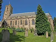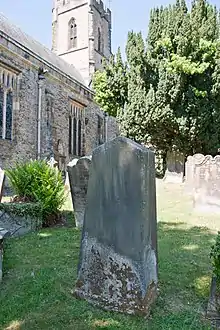 The churchyard has the graves of two soldiers who died at Waterloo and of Robert Willance, a local alderman and draper.[43] Willance was out hunting in 1606 when his horse fell off Whitcliffe Scar with Willance suffering a broken leg and the horse dying.[44] Willance's amputated leg was buried in the churchyard, with Willance being reunited with his leg ten years later when he died.[45][46]