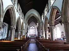 In March 2017, the bells were replaced with modern castings and housed at the same height to make the bellringing easier and to safeguard the tower.[30] The three previous bells, cast c.1500 and 1697, were replaced by eight new bells cast at the foundry of John Taylor & Co in Loughborough.[31] One of the old bells has been preserved in the belfry.[32] The Society of Bellringers of St Mary's Parish Church ring the bells in the church and are recognised as a teaching hub for the local area. The bells are rung in the town for special occasions; either local or national events.[33]