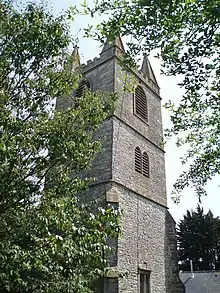The three stage tower is supported by diagonal buttresses to the first stage, a canted stair turret in the return of tower and nave and a very small west door with a canted flat arch under a two-light, chamfered mullion window dating from 1634. The second stage has a cusped two-light window with heavy louvres to the north, a blocked single light to the east and two-light chamfered, vaguely pointed windows south and west. The third stage has one large, round headed window with raised architrave and louvres on each side, thin, embattled parapet dominated by four pyramidal pinnacles with vanes.[1] The spikes above the tower angles were added in the 18th century.[4] The four bells in the tower in 1782 were sent to the Bilbie family of Chew Stoke to be recast and additional metal added to make a set of six bells. The tenor bell was cracked in 1820 and recast in London. In the early 20th century a new roof was put on the tower and the bells rehung.[2]