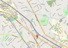 Location of Church of the Good Shepherd in Rosemont, Pennsylvania (white x), in relation to Bryn Mawr College (right) and Villanova University (upper left)