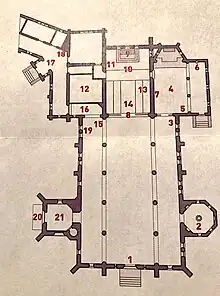Floor plan of the church: (1) west door; (2) baptistry; (3) Good Shepherd votive shrine; (4) Lady Chapel; (5) tower bells console; (6) Marian votive shrine; (7) icons; (8) Rood Screen; (9) High altar; (10) altar rail; (11) bishop's chair; (12) organ pipes chamber; (13) organ console; (14) chancel; (15) Our Lady of Walsingham votive shrine; (16) war memorial; (17) bishop's door; (18) sacristy entrance; (19) nativity window; (20) Good Shepherd statue above the north door; (21) bell tower