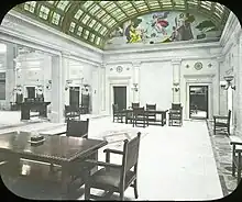 The main bank entrance led to a lobby[4] 38 feet (12 m) wide and 50 feet (15 m) deep.[5] The lobby had a barrel vault ceiling of leaded came glasswork, which provided extensive natural light.[27] The lobby walls[27] and pilasters were clad in Italian marble.[5] The pilasters, architraves, door lintels, and pier above the door featured inlays and designs of colored glass, gold, and mother-of-pearl by Tiffany & Co.[5]