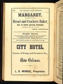 The four-story City Hotel was built in 1832 and was originally known as Bishop's Hotel and then as Richardson's Hotel before it became the City Hotel around 1839–1840.[4][5][6] The City Hotel was owned and operated for many years by a man named Ruggles S. Morse who had come to New Orleans from Portland, Maine.[4][7] When the Verandah Hotel burned in 1855,[8] business increased at the City Hotel.[7] During the war Ruggles provided extensive medical supplies and equipment for the benefit of victims of the 1862 Ponchatoula train wreck who were being treated the marine hospital.[9]