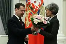 Haigneré receives the Medal "For Merit in Space Exploration" from Russian President Dmitry Medvedev on 12 April 2011 at the Moscow Kremlin