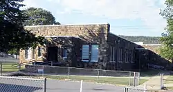 The roof is flat with parapets capped with limestone blocks. Entryways are recessed, and windows are emplaced in groups of two. A drainage ditch dug by the WPA surrounds the building and, like the building, has been kept in excellent condition.