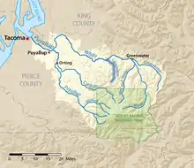The Clearwater River is shown highlighted in the Puyallup River watershed