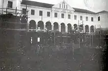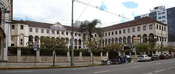 In 1922, the parish ordered the brothers to vacate the premises and build a new school elsewhere. Construction work started in 1924, under the direction of Brother Mauricio. Land was bought in front of the previous premises, and construction was organized by the Brother Mauricio and a special commission that had Canon Meneguzzi and the municipal intendant Celeste Gobbato as honorary presidents. Funding came from loans and donations from the community, including committee members. The school started partial operation in 1928, and was fully operational by the end of 1929.[2] It was originally named Instituto Nossa Senhora do Carmo. The new headquarters were designed by Joseph Lutzenberger and executed by Silvio Toigo, who later built the side wings in the same style.[4] The press reported the school's opening, praising its teaching and the architecture of the building.[5]