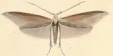 The wingspan is about 20 mm. Adults are ochreous with several whitish streaks on the forewing and distinctively thickened bases to the antennae. Adults are on wing from June to July in western Europe.[2]