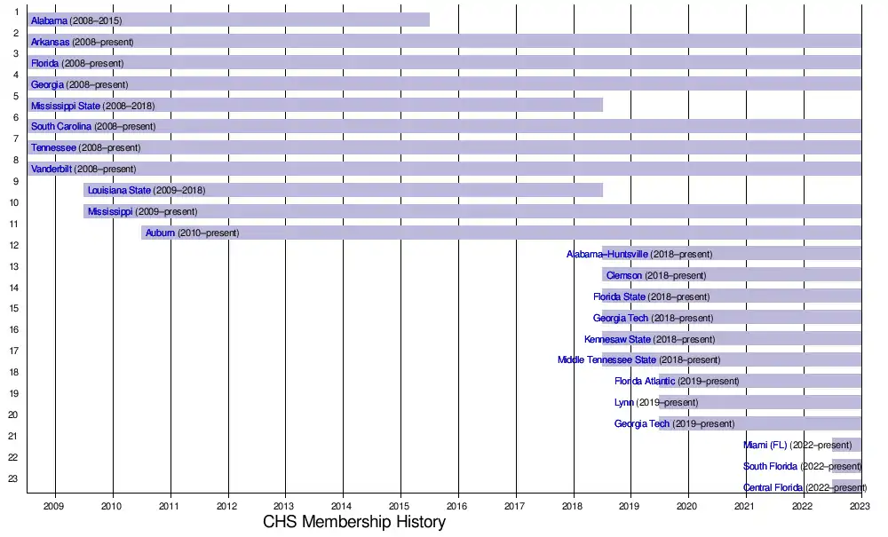 Following the 2014–15 season, both Arkansas and Alabama moved up to ACHA Division 1. Alabama discontinued their participation in the SECHC in 2015, but returned to the conference in 2021.