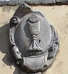 Stone coat of arms of the confraternity placed at the base of the steps (1733).