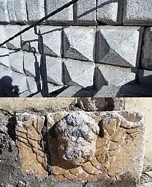 During the construction of the exterior staircase of the collegiate church, stone material from the old collegiate church of ancient Cerreto, which was destroyed in the earthquake of June 5, 1688, was inserted. Top: diamond-pointed ashlar. Bottom: putto in high relief.