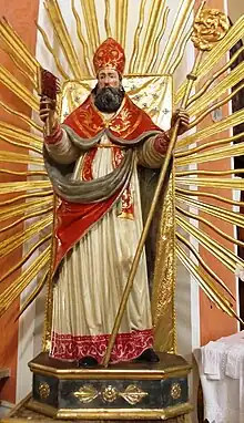 • Fifth chapel: in the niche over the altar stands the wooden statue of St. Blaise, mentioned as early as 1697. The statue is the object of deep devotion on February 3 each year when portions of blessed bread are distributed and eaten immediately after anointing the throat with oil. During the anointing of the throat, it is traditional for the priest to recite the following words, "In the name of St. Blaise, bishop and martyr, I release you from the sore throat and all other evils." Under the vault is a canvas depicting Our Lady with St. Alessio Falconieri, painted in devotion of notary Nicola Mastrobuoni in 1730. On the left wall within a stucco frame is Ecce Homo, a painting from ancient Cerreto; on the right wall is the Crucifixion.[71]