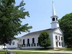 The Town Hall, the Congregational Church, a former chapel (now a gallery), the parsonage and the former house of Eleazor Wheelock (c. 1736) are located around the Green. A new Victorian Revival gazebo is located in the center of the Green. Near the intersection of Route 66 and Route 87 is the town historical marker and a World War I memorial. This intersection is dominated visually by the modern St. Columbia Catholic Church (1953), a brick building with a tall spire.[3]
