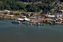 A recent addition to CRMM is the Barbey Maritime Center for Research and Industry, which opened in January 2013.[14] It is located in the Astoria Railroad Depot, a former train station located about 600 feet (180 metres) east of the main museum. The 6,000-square-foot (560 m2) structure was designed by architect Thomas D'Arcy McMahon,[15] built in 1925 for the Spokane, Portland & Seattle Railway (SP&S), and was served regularly by passenger trains until 1952.[16][17] SP&S successor Burlington Northern donated the brick building to the maritime museum in 1987.[14] The city's Historic Landmarks Commission designated the building as historic in 1988.[17] However, the facility continued to be largely unused for many years, and by 2011 it had "fallen into disrepair",[16] as well as incurring minor earthquake damage in 2001.[14][18] In 2011, plans for its renovation and use began taking shape.[18] Work started in June 2012 and was scheduled to include ADA-related accessibility modifications, seismic retrofits and restoration of historic doors and windows, among other changes. The museum plans to use part of the building for constructing boats, and Clatsop Community College expects to use it as a work space for its classes about historic preservation.[17]