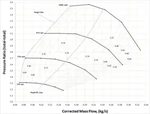 Parameter groups which are used as the basis for gas turbine engine compressor maps are total-pressure ratio (Pexit/Pinlet), , and efficiency. , for example, is simplified below while still being representative of mach number. Maps for other applications use head or discharge pressure and volume flow.[12]