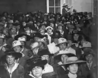 On 22 August, as Lord Derby, British Ambassador to France, who presided, read the roll call of organizations, each delegation rose en masse. The two thousand women, led by an American colored regimental band rose and sang, in French and English, "The Battle Hymn of the Republic".[1] The war program of the French women was reviewed at the conference.[6] A French woman, who wished that her country, her Government, might be wiser, said to the executive committee:— "If you can get the French Government back of this movement, you will have accomplished the liberation of the women of France; a new era will begin for them."[6] Émile Boutroux, one of the leading feminists of France, spoke about aligning French women with the women of the rest of the world. French women realized that day, perhaps for the first time, the power of women. Lyttelton stated that women may have done much, but they purpose to do more. She read a message from President Woodrow Wilson, and then outlined the great purpose of the women war workers, that of establishing a greater sympathy and an ever stronger union between all Allied women.[4]