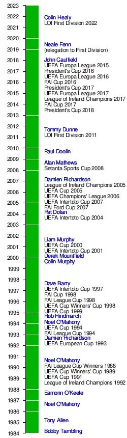 | 2023 | League of Ireland Premier Division, 9th of 10 (relegated via play-offs) | |||
