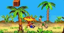 At the beginning of the game, Crash has the ability to jump to navigate ledges, spin in a tornado-like fashion to break open crates and defeat enemies, deliver a body slam to break open tough objects and can either slide across the ground or crouch and crawl to get past low areas.[7] Crash can expand on these abilities by defeating boss characters, often resulting in more powerful attacks or increased jumping and running prowess.[8] Crash starts the game with six lives. Crash loses a life when he is struck by an enemy attack or suffers any other type of damage. More lives can be earned by instructing Crash to collect 100 "Wumpa Fruits" or break open a special crate to collect a life. Crash can be shielded from enemy attacks by collecting an Aku Aku mask. Collecting three of these masks allows temporary invulnerability from all minor dangers.[9]