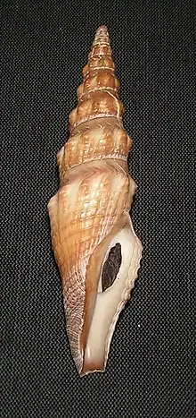 The turreted shell is acuminated and blackish brown. The whorls are tuberculated in the middle, dotted round the lower part, whilst the upper part exhibits a depression from the rilling up of the sinus. The siphonal canal is recurved.[2]