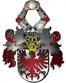 The von Creuzburg coat of arms consists of a red eagle on a silver field. On the helmet, two red arms dressed in silver hold a silver ball. The helmet covers are silver and red.