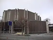 Christchurch Town Hall, with the pedestrian bridge connecting it to the adjacent hotel visible on the right