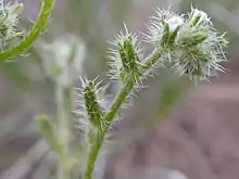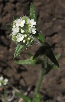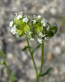 These are annual or perennial herbs usually coated in rough hairs and bearing rounded flower corollas that are almost always white, but are yellow in a few species.[1] Several morphological characters are used to distinguish species from one another, but the most definitive is the form of the nutlet, which varies in shape, size, color, and pattern of attachment.[1]