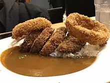 Plate of Curry House curry rice topped with menchi katsu and onion rings