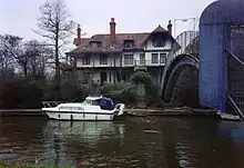 Carte intended to use the island as a special secluded annex, accessible by boat, to his new Savoy Hotel, but a panel of local magistrates refused to grant him an alcoholic drinks licence for the property.[5] Instead, Carte had a 13-bedroom mansion, Eyot House, built on the island, and it became one of his main residences.[6][7] Among the famous guests who stayed at the house were the dramatist W. S. Gilbert and the composer Arthur Sullivan.[8] In later years, Carte displayed his macabre sense of humour by keeping a crocodile on the island.[9]