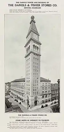 Built as part of the Daniels & Fisher department store in 1910, it was the tallest building between the Mississippi River and the state of California at the time of construction, at a height of 325 feet (99 m).[2] The building was designed by the architect Frederick Sterner and modeled after The Campanile (St. Mark's Bell Tower) at the Piazza San Marco in Venice, Italy.[3] The 20-floor clock tower has clock faces on all four sides. May Company purchased Daniels & Fisher in 1958, and the store vacated the tower. When the store was demolished (ca. 1971), the tower was saved and renovated into residential and office space in 1981. A 2½ ton bell occupies the top two floors of the building, above the observation deck.