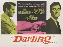 Darling is a 1965 British romantic drama film directed by John Schlesinger from a screenplay written by Frederic Raphael.[5] It stars Julie Christie as Diana Scott, a young successful model and actress in Swinging London, toying with the affections of two older men, played by Dirk Bogarde and Laurence Harvey. The film was shot on location in London, Paris and Rome and at Shepperton Studios by cinematographer Kenneth Higgins, with a musical score composed by Sir John Dankworth.