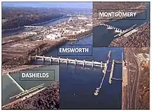 Dashields Lock and Dam is a fixed-crest dam on the Ohio River.[1][2] It is located less than 15 miles down stream of Pittsburgh. There are two locks, one for commercial barge traffic that's 600 feet long by 110 feet wide, and the recreational auxiliary lock is 360 feet long by 56 feet wide.[3] Dashields locks averages about 450 commercial lock throughs every month and 200-300 lock throughs a month on the recreational auxiliary lock.