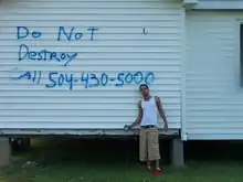 A resident of Davant standing in front of his grandparents house which had floated off their property. The writings "Do not destroy" in front of his house was to let local government clean up crews know the house was going to be moved and restored.