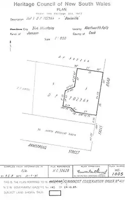The first land grant in the area of Wentworth Falls was of 25 hectares (61 acres) to Edward Dougherty in 1857. The property on which Davisville was built was originally part of Dougherty's grant.[1] In 1858 the land was bought by Archibald Campbell who owned it while the subdivision of Brasfort was formed. His daughters sold the Davisville subdivision to David Davis in 1888. Davis was an early purchaser of land along Falls Road (then Boonara Street). He appears to have built/ developed or owned a number of houses along Falls Road including no. 69, 74, 85 and 63.[2][1]