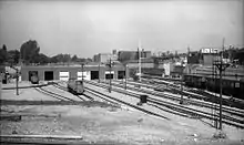 Davisville Yard acted as the main maintenance and storage yard for Toronto's Yonge subway, which opened between Union Station and Eglinton Avenue in 1954.[2] The first two subway cars (5000 and 5001) were delivered to the TTC's Hillcrest Complex, but subsequent subway cars were delivered to Davisville yard via the Toronto Belt Line Railway. Before the opening of the subway, there was a temporary interchange track between the Yonge streetcar line and the Davisville Yard on the north side of the Belt Line bridge for the interchange of rail equipment with the streetcar system.[3] In 1953, subway cars 5000 and 5001, after being displayed at the Canadian National Exhibition, were mounted on shop bogies and towed at night over streetcar tracks by a Peter Witt motor to the Davisville Yard via the temporary interchange. (The two subway cars had arrived at the CNE from Hillcrest via the Bathurst streetcar line. At the CNE, the two cars were displayed on their own bogies.)[4]