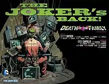 The return of the Joker since his initial New 52 appearance in Detective Comics #1 was teased in early July 2012.[32] "Death of the Family" was first printed between October 2012 and February 2013, and spanned 23 individual issues across nine separate series, each focusing on individual members of Batman's extended supporting cast: Batman (#13-17), which served as the main plot between Batman and the Joker; Batgirl (#13-16); Batman and Robin (#15-16) which focused on Batman's son Damian Wayne, the current Robin; Catwoman (#13-14); Detective Comics (#15-16) which focused on Batman; Nightwing (#15-16); and Suicide Squad (#14-15), which focused on Joker's sometimes girlfriend Harley Quinn. The arc also included a crossover story in Red Hood and the Outlaws (#15-16) and Teen Titans (#15-16), which focused on both the former Robin, Jason Todd, and Red Robin, starting story threads in one series that were then concluded in the other.[33] The story began with issues #13 of Batman, Batgirl, and Catwoman, the latter two serving as a prelude to the story. The series were published monthly and all concluded in January 2013, except for Batman, which published its seventeenth issue in February, the final chapter of the story.[33] At the 2014 Chicago Comic & Entertainment Expo, Scott Snyder revealed the story was always intended as "a two-part story", and his idea for the second story would be about how much the Joker hates Batman.[34]