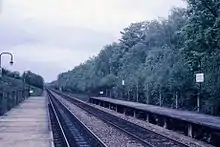 The station was opened on 22 July 1912,[1] at the request of the Golf Club, which had opened the previous year.[2] It is on what was the Great Western and Great Central Joint Railway, which had been opened in 1906. The station was originally called Denham Golf Club Platform, and it was built to serve the adjacent golf club. Between the two World Wars the platforms were lengthened and the station was made a halt. The original "up" platform was on the London side of the road bridge, and made of wood, with an access path connecting to the track leading to the Golf Club. In 1954[3] British Railways had a new concrete "up" platform built on the Wycombe side of the road bridge, opposite the "down" platform, which was also rebuilt in concrete. At the same time a proposed name change to 'Higher Denham' was rejected.[2]