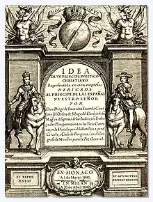 In 1640, Saavedra published the anti-Machiavellian emblem book Empresas Políticas. Idea de un príncipe político cristiano ("Political Maxims. Idea of a Christian Political Prince"), a hundred short essays about the education of a prince.[3][4] This work was written primarily for the son of King Philip IV. It passed through a number of editions and was translated in several languages. An unfinished historical work, entitled Corona gótica, castellana, y austriaca políticamente ilustrada, appeared in 1646. Another work ascribed to Saavedra, the República literaria, was published posthumously in 1670; it is a satirical discussion on some of the leading characters in the ancient and modern world of letters.[2] Saavedra's Idea de un príncipe político cristiano ("The Idea of a Christian political prince", 1640) was a very erudite work that uses the literary sort of emblem, put by Andrea Alciato with his Emblemata translated in 1549 and that has a mainly moral and philosophical character. His work, however, was mainly inspired by the Emblemata política (1618), by Jakob Bruck Angermunt, being the intention of the author to compose a guide for the suitable political formation of a Christian prince. As a historian wrote Corona gótica, castellana y austríaca (1648), that tried to be a biographical repertoire of the Visigothic kings of Spain.