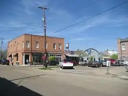 The unusual layout of the town dates from 1813, and is deemed a contributing site in the listing. It was laid out in 360 feet (110 m) square blocks, each with a small central square; the squares became known as "oxlots" due to tethering of oxen and other livestock in them.[2]