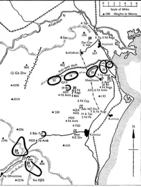 The remainder of Div Cav left Matruh for Fuka on 27 June, receiving new Bren Gun Carriers at Baggush. A Squadron prepared the new carriers for battle.[56] After a report of approaching Axis tanks, the squadrons were withdrawn to Daba on 28 June and to Fortress A in the afternoon. On 30 June, the regiment screened west and south of the box. From 1 July, the regiment fought in the First Battle of El Alamein. B Squadron was shelled on 1 July and withdrew to the Deir el Munassib. The regiment probed ahead of the box, engaging the Axis forces, and B Squadron lost a carrier to anti-tank guns on the Alam Nayil ridge. The Axis forces were halted by a New Zealand counter-attack led by Brigadier Weir. Alam Nayil was captured by Weir's force on 3 July and C Squadron held the ridge while Weir's force pressed ahead. After the Italian guns on the ridge were destroyed, C Squadron withdrew and came under fire from Ruweisat Ridge. On 3 July, A Squadron reconnoitred around Gebel Kalakh and was ineffectually shelled by the friendly 6th Field Regiment. Two troops from A Squadron engaged an Italian truck-mounted battalion of the Trieste Division, destroying two trucks, capturing one Italian and releasing three Indian PoWs.[57]