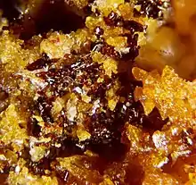 Dorrite is a silicate mineral that is isostructural to the aenigmatite group.[2] It is most chemically similar to the mineral rhönite [Ca2Mg5Ti(Al2Si4)O20], made distinct by a lack of titanium (Ti) and the presence of Fe3+.[2] Dorrite is named for Dr. John (Jack) A. Dorr, a late professor at the University of Michigan that researched in outcrops where dorrite was found in 1982.[3] This mineral is sub-metallic resembling colors of brownish-black, dark brown, to reddish brown.