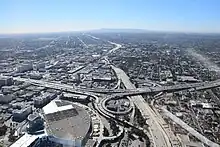 In 1969, the California Highway Commission approved a plan to lease 164,000 square feet (15,200 m2) of space underneath the interchange to the California Highway Patrol, with the CHP constructing an office building with room for 100 police cars, as well as automobile and truck inspection areas, on the site.[18] Aside from the CHP office, a number of prominent Los Angeles landmarks abut the interchange, including the L.A. Live entertainment complex, which includes the Los Angeles Convention Center and Crypto.com Arena.[19]