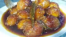 Dosi (Sinhala: දෝසි, Tamil: தோசி) is a traditional Sri Lankan confectionery,[1] similar in nature to fruit preserves or candied fruit. The dish is prepared by boiling segmented fruit in sugar and allowing it to cool in order for the sugar to crystallise on both the surface and the inside of the fruit. Dosi are traditionally served as a snack, during the day or after a meal.[2] It is a dish that is commonly served by Sri Lankan Malays as a part of traditional Eid al-Fitr celebrations, marking the end of Ramadan. It is also popular during weddings, religious festivals and other social functions and celebrations. Variations include the addition of cardamom and/or cinnamon and/or rose essence.