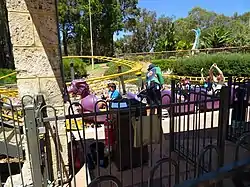 | Trains | Single train with 6 cars. Riders are arranged 2 across in a single row for a total of 12 riders per train. |