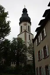The so-called Läutturm (bell tower) belonged to the medieval St. Georgen Church, of which nothing has survived. Between 1689 and 1822 the tower remained only as a stump. In 1818, the Sprinkhorn et Schrader foundry in Frankenthal cast a three-voiced bell that proved to be too large for the ridge turret of the Trinity Church built in 1717. Therefore, the bell tower was rebuilt to accommodate the new bell. On July 2, 1891, the tower burned including the clock and bells. In the same year Andreas Hamm poured a new bell from Frankenthal with the tones of the C minor triad (c1, es1 and g1), which were thus tuned to the bell of the cathedral. They bore the inscriptions "God's Word Remains for Eternity", "There Is Still Rest in the People of God" and "Rejoice in the Lord All Ways". First they were hung up in a bell house on the church garden and after the reconstruction of the bell tower they had to be ringable; in 1917 the bells had to be collected for war purposes. This was followed in 1924 by three bells from the same foundry, this time in the tones c1 (emergency bell), es1 (faith bell) and f1 (sky bell). In the Second World War, this bell was destroyed.[12] Since 1951, the Vaterunserglocke (Lord's Prayer bell) has hung in clay b1 in the ridge turret of the Dreifaltigkeitskirche itself; it was cast by Friedrich Wilhelm Schilling. In 1964, the Karlsruher Glocken- und Kunstgießerei cast three bells for the bell tower with the same striking tones as the first bell (C minor triad).[13]