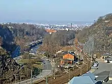 The Haltepunkt Plauen bei Dresden ("Plauen near Dresden halt") was opened on 18 June 1855 together with the Albertsbahn (Albert's Railway) and was located to the left (south-east) of the railway. In 1897, the so-called Alte Bahnhof (old station) Plauen was opened with the station building located near the right-hand side of the current tracks. A few months later, the original building was demolished, when the connection to the Felsenkeller brewery was built there.[3] A waiting room was erected in its place, which was moved to the Boderitz-Cunnersdorf halt of the Windbergbahn (Windberg Railway, a former mining railway now used as a heritage railway) in 1923 and still exists today (2016). In 1903, after the incorporation of the village of Plauen into Dresden, the station's name was changed to Dresden-Plauen. Since the station was located quite poorly for the population of Dresden-Plauen, which had now grown to 12,000 people, a new station was opened about 800 m further north in January 1926 and the old station was closed.[4] This halt, opened in 1926, is to be renovated by the middle of 2018.[5] The entrance building that was built in 1897 (the old station) was renovated in the late 1990s and today houses a glass workshop (2016).[3]
